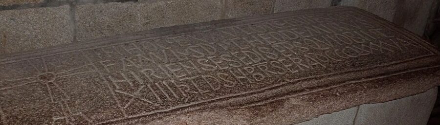 Jahrhundertelang war die Grabstätte des Apostels Jakobus in Vergessenheit geraten, bis eben Pelagius, der Einsiedler, Bischof Theodemir von seiner Lichterscheinung erzählte. Man vermutet zwischen 812 bis 834 nach Christus. – FotoAusschnitt: Grabplatte…