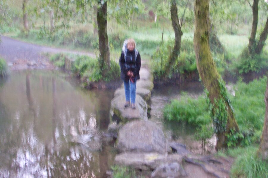 Es hilft nichts, wir müssen diesen steinernen Steg unbedingt überwinden, nacheinander. Rechts Wasser, links Sumpf. Die Steine sind glitschig. „Hoffentlich rutsche ich jetzt nicht runter“, denke ich so bei mir, vornweg marschierend.