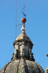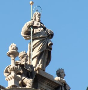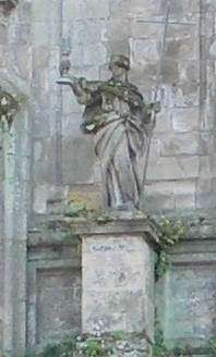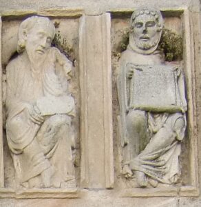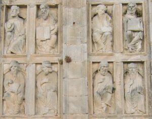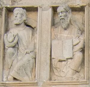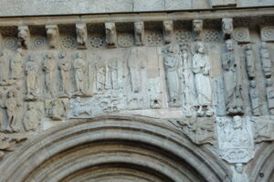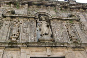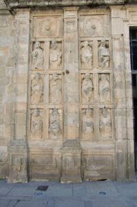 Was sehen wir? Ein Tor eingerahmt von 24 Propheten- und Apostelfiguren, erbaut von Meister Mateo um 1188, das prinzipiell nur in den Heiligen Jahren geöffnet ist. Darüber den Apostelfürsten Jakobus als Pilger rechts und links flankiert von seinen Helfern Teodoro und Atanasio, geschaffen 1694 von Pedro Docampo. „Wir sind vom Tod in das Leben hinübergegangen, weil wir die Brüder lieben“ – 1 Joh 3,14. Gut von den damaligen Pilgern nachzuvollziehen, führt doch die Heilige Pforte nach innen vom Platz Quintana de los muertos – Platz der Toten.