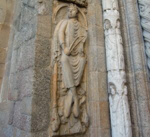 Das Südportal – Puerta de las Platerias – wird schon von französischen Besuchern zwischen 1137 und 1143 erwähnt. Vom Pilgerführer Liber Sancti Jacobi ist eine genaue Beschreibung sowohl des Nord- wie des Südportals erhalten. Danach befand sich über dem südlichen Doppelportal ein Fries von lebensgroßen Figuren mit dem segnenden Christus im Kreis seiner Apostel. Der dargestellte Jakobus, zwischen zwei Baumstämmen (Zypressen) befindlich, ist gleichermaßen an der Porte Miegeville in Toulouse zu sehen, sodass davon auszugehen ist, dass die Jakobsfigur vom Südportal dem Zeitraum um 1118 entstammt; s.u.