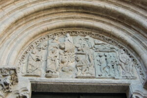 Wir stehen staunend vor den beiden Rundbögen, die hier nur ansatzweise angedeutet werden können, gestützt von Figuren geschmückten Säulen. Beide Tympana sind durchsetzt von biblischen Ereignissen: Passion Christi, Gefangennahme, Geißelung und Verurteilung durch den Statthalter Pilatus. Dann wiederum ein völlig neues Bild mit einer Heilungsszene Jesu Christi, den Heiligen Drei Königen, etc.