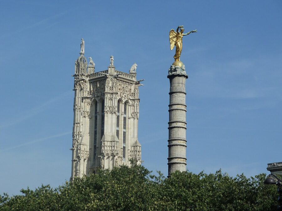 Start des französischen Jakobsweges in Paris: Tour Saint-Jacques und Säule der Fontaine du Palmier (von der Rue de Rivoli aus gesehen)