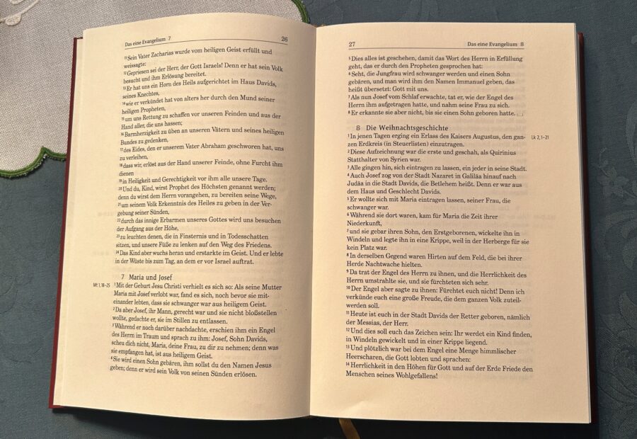Sich unbedingt das von der Kirche anerkannte „Eine Evangelium“ besorgen, damit gut gerüstet für Gespräche zu sein: mit den Kollegen, den Verwandten, innerhalb der Familie, mit Freunden, in der Mission. Gut geeignet für junge Menschen, die sich auf die Firmung vorbereiten; für den Bibelkreis in der Gemeinde.