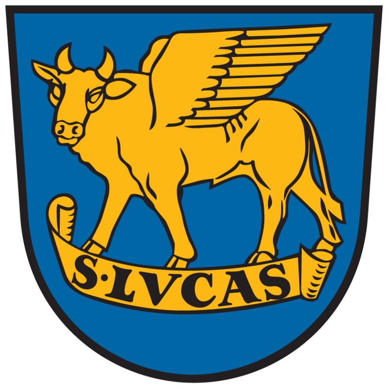 Foto: St. Lucas. Wappen von Bleiburg. Markus: Symbol Löwe + Johannes: Symbol Adler + Matthäus: Symbol Mensch, zumeist als Engel dargestellt.