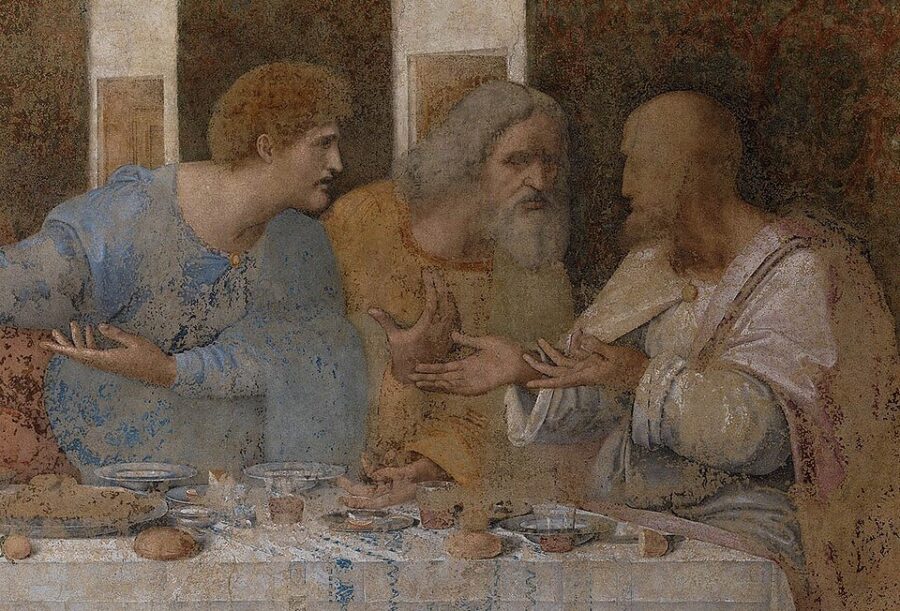 Foto. Apostel Matthäus (links) – Detail aus dem Wandgemälde Das Abendmahl von Leonardo da Vinci. Detail of three disciples on the far left side of the table in Leonardo da Vinci’s Last Supper.