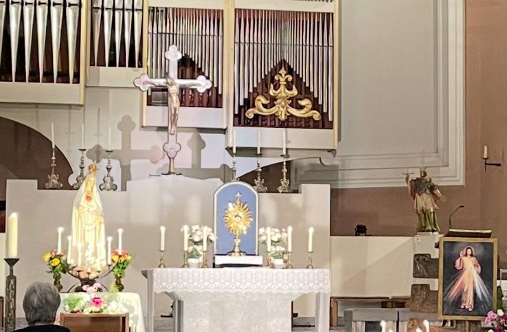 Im Vordergrund die Monstranz mit dem Allerheiligsten, einer konsekrierten Hostie (Erklärung s.u.). + Links neben dem Altar die Figur der allerseligsten Gottesmutter und Jungfrau Maria. + Rechts das Bildnis Jesu Christi, das nach der Vision der heiligen Faustina gemalt wurde und weltweit Verbreitung findet. Es zeigt den gekreuzigten und auferstandenen Christus. Mehr über die Bedeutung.