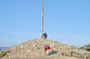 Traumhaftes Wetter. Die Sonne scheint. Ich bin ein wenig vorgelaufen, schnell nehme ich das Steinchen, werfe es auf den Steinhaufen, es symbolisiert die auf dem Weg hinter sich gelassenen Sünden, vielleicht schon die erfahrene Läuterung? Ich halte inne. Elke steht die Erschöpfung ins Gesicht geschrieben. Sie ist eine willensstarke, mittlerweile gut trainierte Frau. Stehen minutenlang vor dem Kreuz, registrieren abwesend, gedankenverloren die dort abgelegten Gegenstände, manches Unnützes und Profanes ist darunter. Meditieren ein wenig.