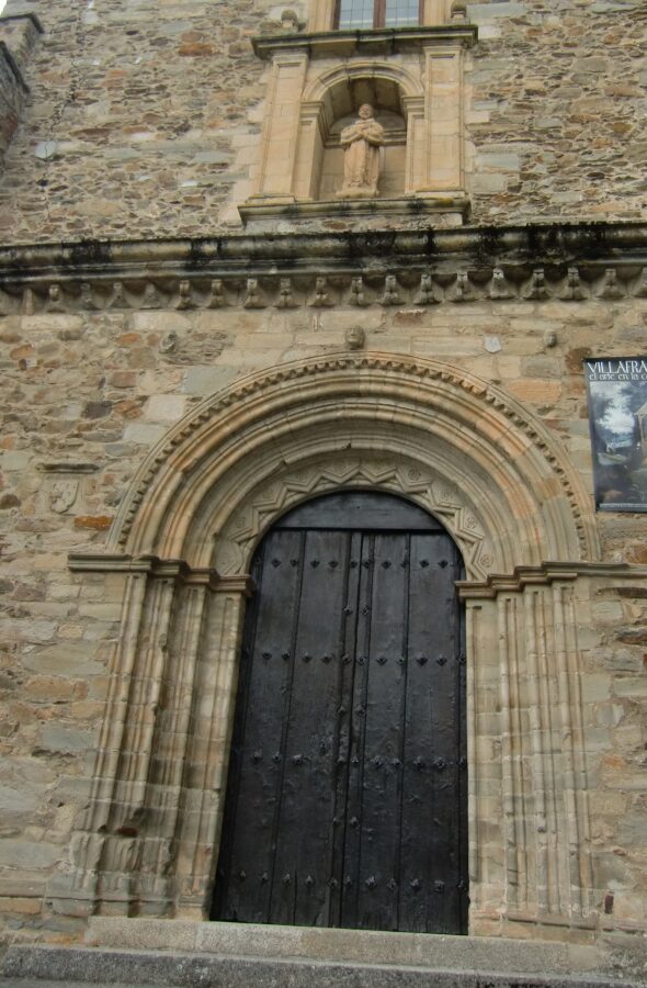 Von den dort beheimateten vielen Kirchen sticht die Kirche Santiago, Gründung 12. Jh., hervor. Ihr zum Pilgerweg gewandtes Nordportal, die Puerta del Perdon – Tor der Vergebung resp. der Absolution *) schälte sich rasch als Magnet für die Pilger heraus.