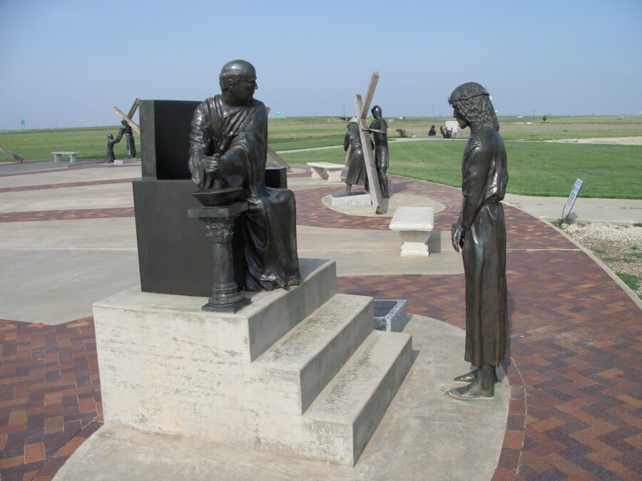 Staatsvertreter versus Christentum. Die Abschnitte des Johannes-Evangeliums 18 und 19 geben Aufschluss. + Pilatus fragt Christus, ob er ein König im politischen Sinne sei (Kapitel 18, 37)? + Christus beantwortet sie im Sinne des transzendenten Reiches Gottes. + Pilatus: Was ist Wahrheit? + Jesu Antwort – er selbst ist die Wahrheit -: „Jeder, der aus der Wahrheit ist, hört meine Stimme.“ + FotoAuschnitt: Groom, Texas in 2005.