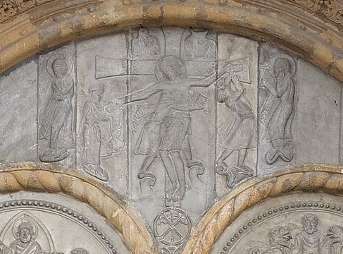 Typisch für die damalige Zeit das romanische Portal mit zwei Toren und einer tragenden Säule. Darüber das Tympanon (ausgeschmücktes Bogenfeld von Portalen), in diesem Falle unterteilt in zwei kleinere Halbkreise aus Marmor gearbeitet. Damit gab es Raum für drei Darstellungen aus der Bibel – Neues wie Altes Testament. In den gewölbten Bögen (Archivolte, Arcus volutus) sind zig Personen zu betrachten. Im oberen Bereich dürfte König David als Harfenspieler dabei sein, im unteren Bogen Handwerker, wenn ich es richtig deute.