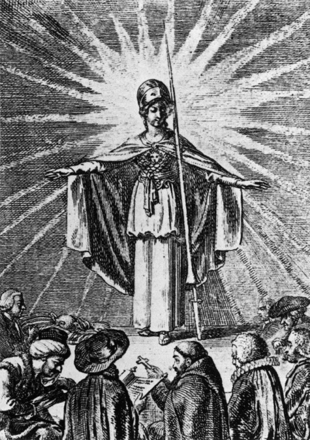Die aufgeklärte Weisheit als Minerva, römische Göttin, schützt die Gläubigen aller Religionen; spendet das Licht der Erkenntnis *). Daniel Chodowiecki, 1791.