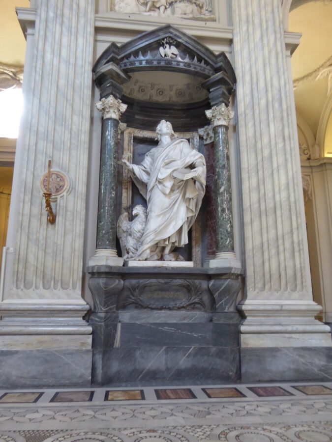 Einzeldarstellung des Apostels Johannes. Werk von Camillo Rusconi: Heiliger Johannes, 1705-1711, Marmor, Basilica of San John Laterano, Rom + Sein Wappen links vom Betrachter: der Adler. + Foto aus 2015 + San Giovanni in Laterano.